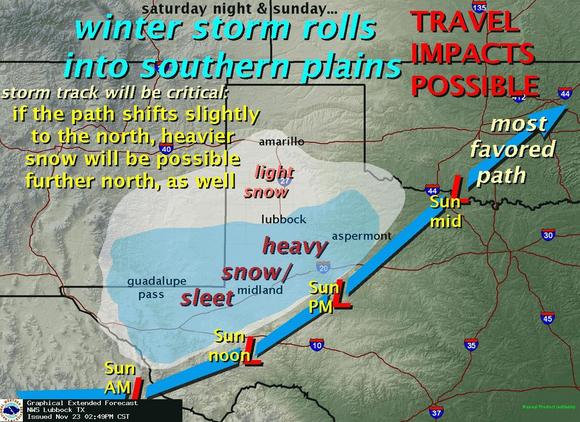 I am in the blue heavy snow area, so I may be seeing as much as another 5 inches late tonight and tomorrow. I am quite enjoying all this snow! This is on the heels of a couple of weeks of temps in the upper 70s to low 80s. In fact, the day before Thanksgiving it was in the 80s! Welcome to west Texas weather! If you don’t like the weather here, just wait a minute! Not only is the snow great, when we have an active winter, my experience has been we usually have an active severe weather season in the spring.
